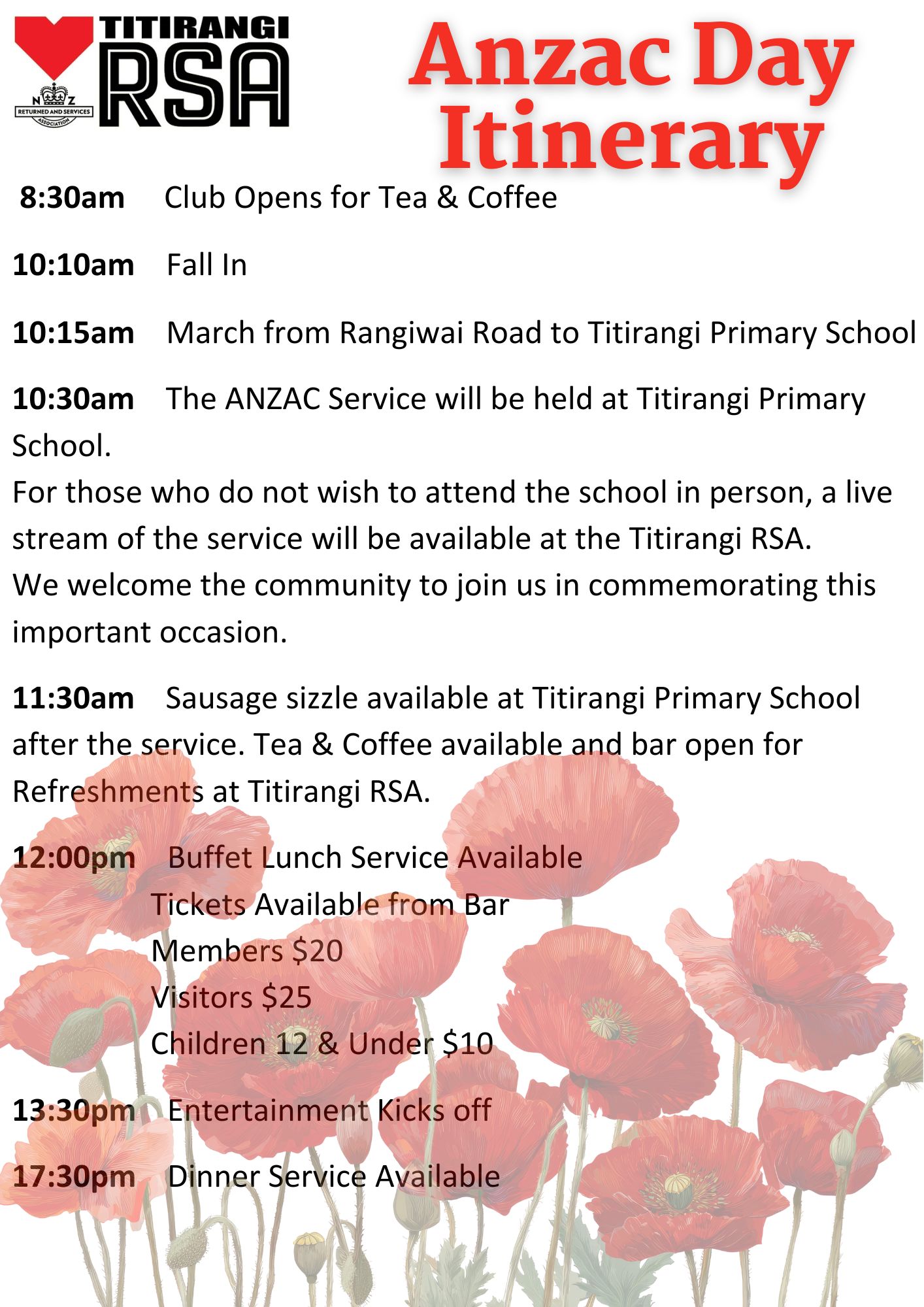 Please see our Anzac Day Itinerary for all information regarding march, service and what is happening in the club